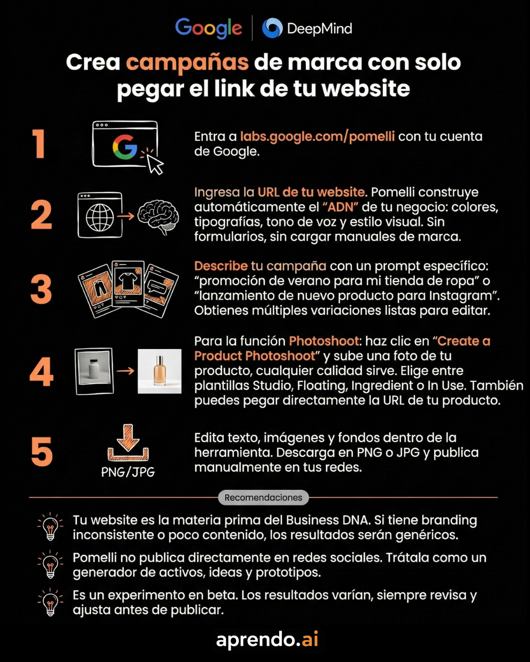 TIPS / HACKSCrea campañas de marca con solo pegar el link de tu websitePomelli, la herramienta de Google, por fin está disponible en LATAM. Es un experimento de Google Labs con Google DeepMind que funciona como una mini "agencia de marketing" impulsada por IA. Solo pegas el link de tu website, extrae la identidad visual y de comunicación de tu marca, y genera campañas completas, copies e imágenes para redes. Incluso tiene la función "Photoshoot" para crear fotos profesionales de tus productos, todo alineado con tu estilo. Es gratuita y no requiere conocimientos de diseño.  |