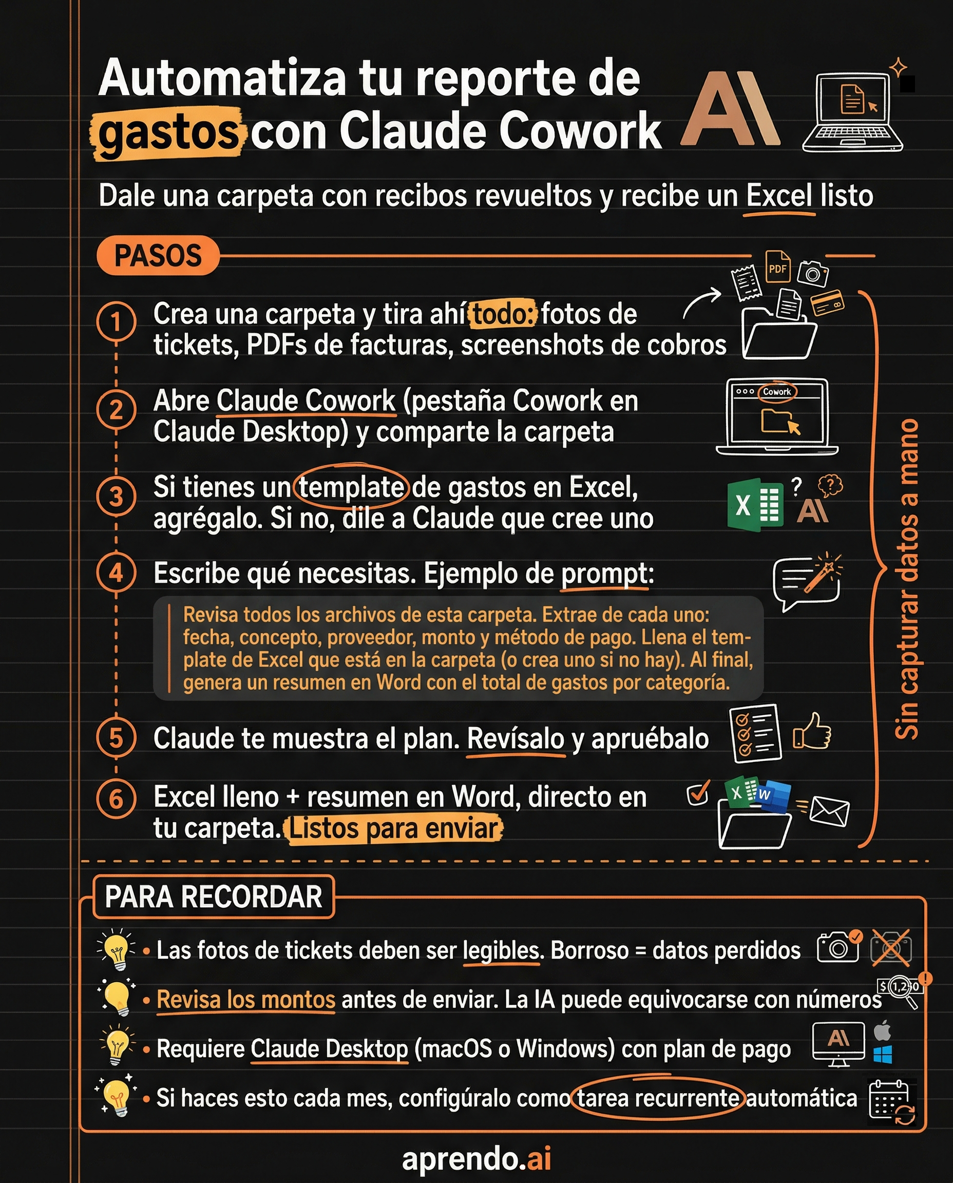 TIPS / HACKSAutomatiza tu reporte de gastos con Claude CoworkSi trabajas en ventas, conoces el dolor: regresas de un viaje con 15 tickets de casetas, facturas de gasolina, hotel, restaurantes, comprobantes de banco, y todo tiene que terminar en un Excel ordenado para pedir tu reembolso. Lo normal es sentarte a capturar uno por uno: abrir el ticket, buscar el monto, la fecha, el concepto, y escribirlo en la hoja. Claude Cowork puede hacer ese trabajo por ti. Le das una carpeta con todo revuelto (fotos, PDFs, screenshots), y él lee cada archivo, extrae los datos y te entrega un Excel listo con el desglose completo.  |
