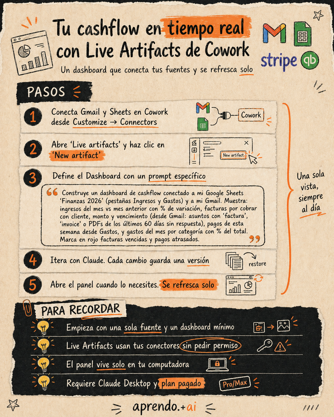 TIPS / HACKSTu cashflow en tiempo real con Live Artifacts de CoworkDecidir si contratas a alguien este mes, si te alcanza para invertir en marketing o si el negocio realmente está creciendo depende de tu cashflow al día. Esa información vive partida entre tu Excel/Google Sheets, las facturas en Gmail y el saldo del banco, y armarla toma hasta 2 horas cada vez. Con Live Artifacts en Cowork construyes un Dashboard interactivo que cruza esas fuentes una sola vez y se refresca solo cada vez que lo abres.  |